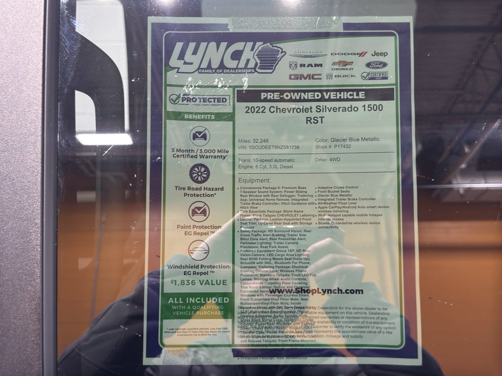 For sale in Burlington, WI: a well-maintained 2022 Chevrolet Silverado 1500 RST with 32,246 miles, 4WD and a fuel-efficient 6-cylinder 3.0L diesel engine. This Chevrolet Silverado RST combines powerful towing capability and excellent highway fuel economy, making it ideal for work or weekend getaway. The exterior presents a bold, modern look while the interior offers comfort and convenience for daily driving.