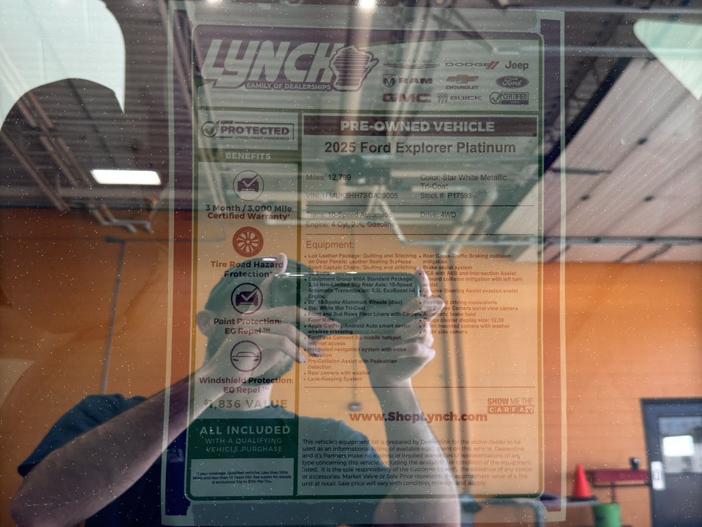2025 Ford Explorer Platinum - Burlington, WI. This low-mileage 4WD SUV (12,799 miles) combines premium comfort with capable performance thanks to its efficient 4-cylinder, 2.3L gasoline engine. Perfect for Wisconsin winters and weekend road trips, the Platinum trim delivers refined style inside and out with leather seats and heated steering wheel for next-level comfort.