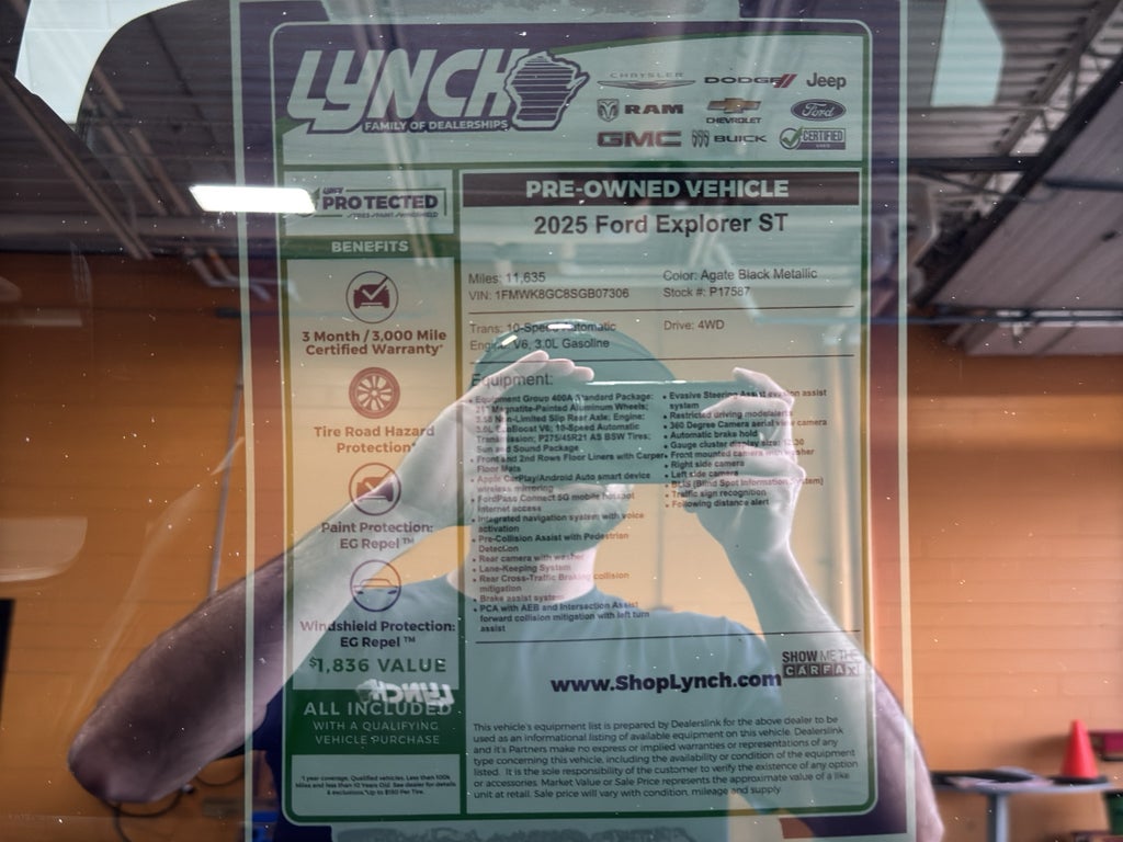 Experience driving excitement with this 2025 Ford Explorer ST-located in Burlington, WI-featuring a powerful 3.0L V6 gasoline engine and dependable 4WD. With just 11,635 miles, this low-mileage SUV blends athletic performance with everyday practicality. The ST's turbocharged V6 delivers responsive acceleration and confident towing capability, while the 4WD system provides traction and control in Wisconsin weather.