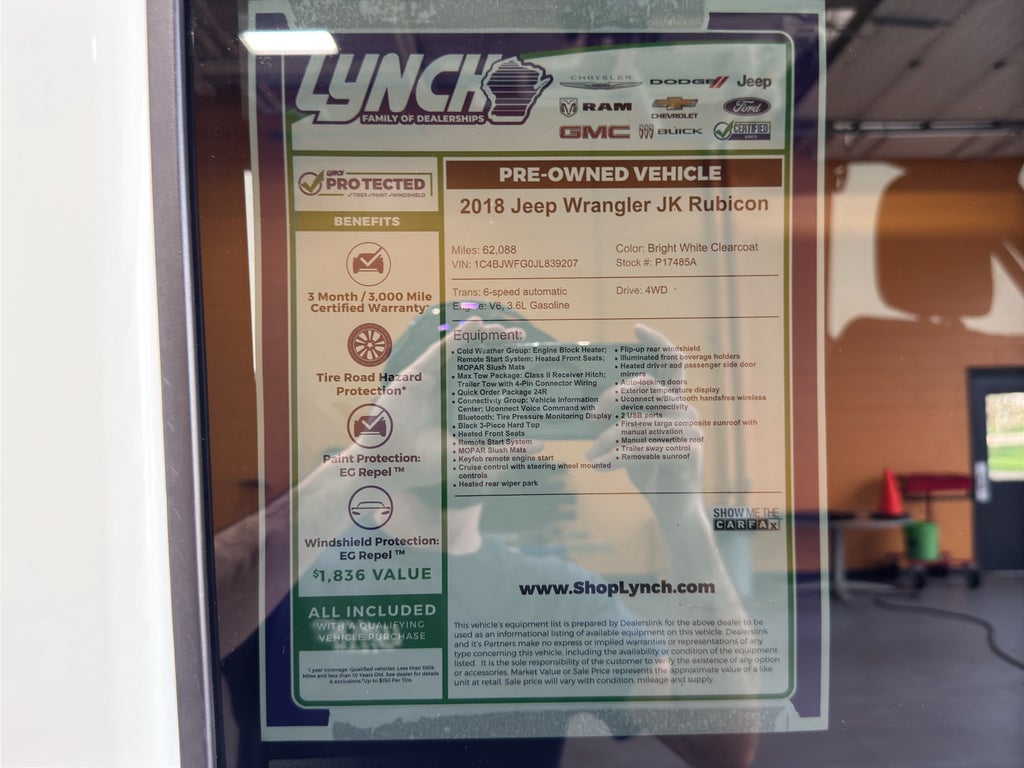 Cold Weather Group: Engine Block Heater; Remote Start System; Heated Front Seats; MOPAR Slush Mats. Max Tow Package: Class II Receiver Hitch; Trailer Tow with 4-Pin Connector Wiring. Quick Order Package 24R. Connectivity Group: Vehicle Information Center; Uconnect Voice Command with Bluetooth®; Tire Pressure Monitoring Display. Black 3-Piece Hard Top. Heated Front Seats. Remote Start System. MOPAR Slush Mats. **Equipment listed is based on original vehicle build and subject to change. Please confirm the accuracy of the included equipment by calling the dealer prior to purchase.**
