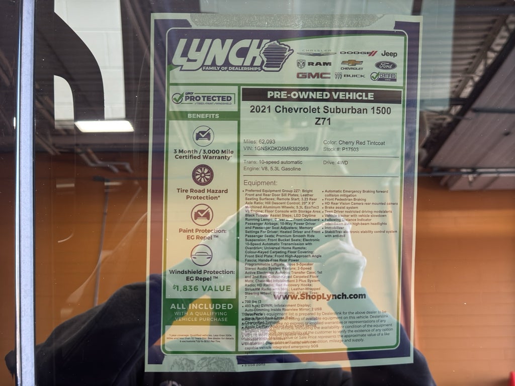 Apple CarPlay: Seamless smartphone integration for this 2021 Chevrolet Suburban 1500 - stay connected and entertained on the go! It features a high end BOSE stereo system. The leather seats are soft and supportive on this 1/2 ton suv. This 2021 Chevrolet Suburban 1500 offers Automatic Climate Control for personalized comfort. The state of the art park assist system will guide you easily into any spot. Start this model from inside with remote start. This unit is equipped with the latest generation of XM/Sirius Radio. This vehicle comes equipped with Android Auto for seamless smartphone integration on the road. This 2021 Chevrolet Suburban 1500 has a clean CARFAX vehicle history report. See what's behind you with the back up camera on it. Bluetooth® technology is built into the Chevrolet Suburban, keeping your hands on the steering wheel and your focus on the road. Make room for more passengers, carry extra luggage or your favorite sports gear with the roof rack on the Chevrolet Suburban.