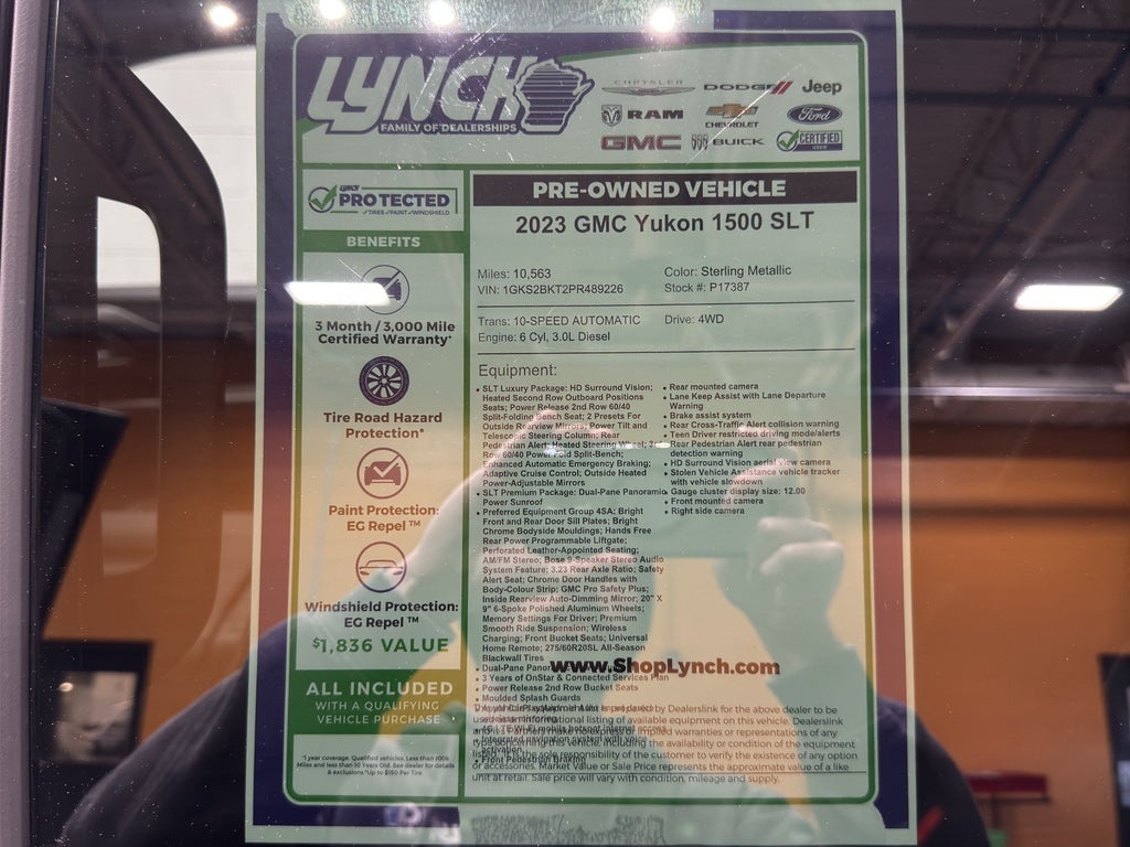 For sale in Burlington, WI: a low-mileage 2023 GMC Yukon 1500 SLT with just 10,563 miles. This rugged, refined SUV features a 6-cylinder, 3.0L diesel engine and dependable 4WD — ideal for both highway cruising and Wisconsin winters. You'll appreciate premium SLT comforts plus advanced safety and convenience tech like Navigation, Lane Departure Warning, Remote Start, Back-Up Camera, and a CARFAX Clean Report for added peace of mind.