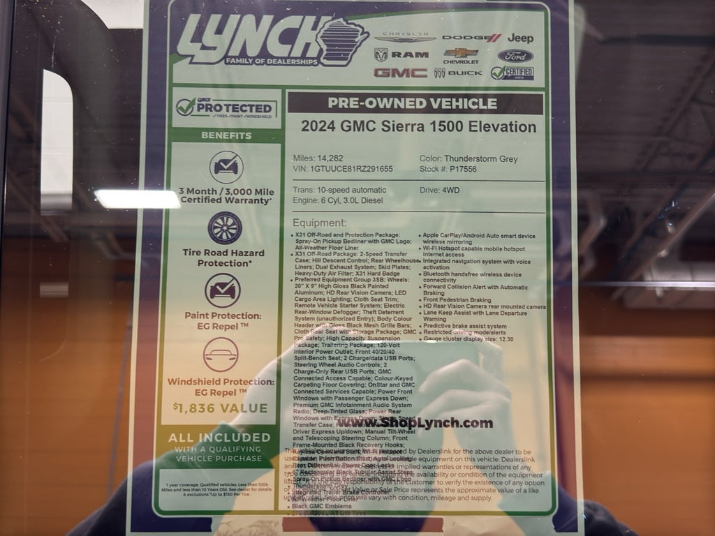 Discover this 2024 GMC Sierra 1500 Elevation, a rugged and refined pickup ready for Burlington, WI roads and trails. With just 14,282 miles, this low-mileage GMC Sierra delivers diesel efficiency and serious capability thanks to its 3.0L 6-cylinder diesel engine and dependable 4WD system. Whether you're towing, commuting, or exploring off the beaten path, the GMC Sierra Elevation combines power and fuel economy in a stylish package.